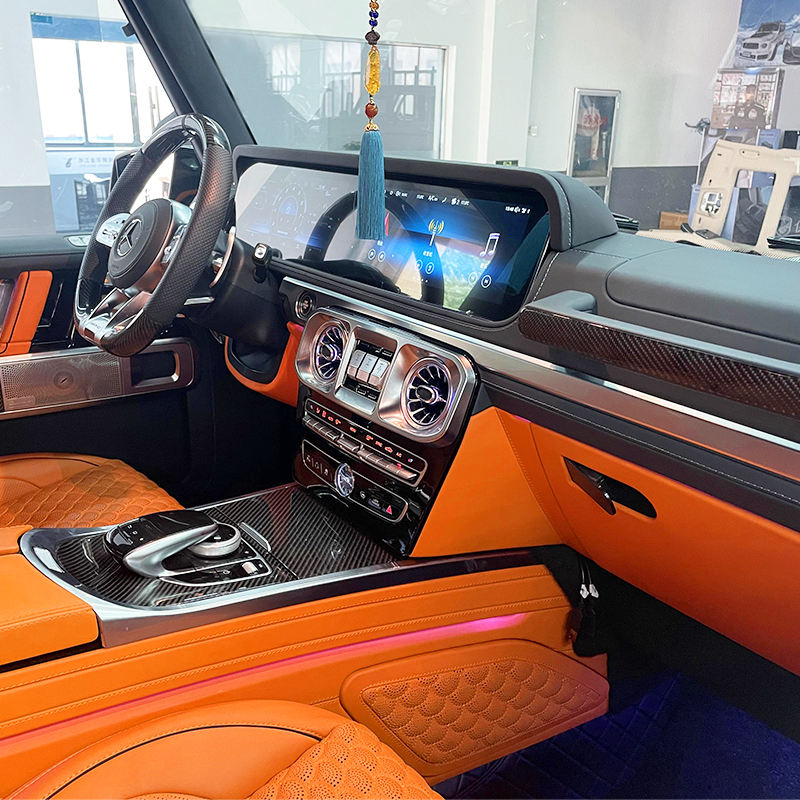 This upgrade is typically pursued by owners who appreciate the classic G-Class aesthetic but desire modern conveniences such as larger displays, digital gauges, enhanced connectivity, and improved materials. Common elements include the replacement of the analog dashboard with a digital instrument cluster, installation of the COMAND Online or MBUX infotainment system, updated HVAC control panel, redesigned center console, and integration of newer seat designs or trim finishes.