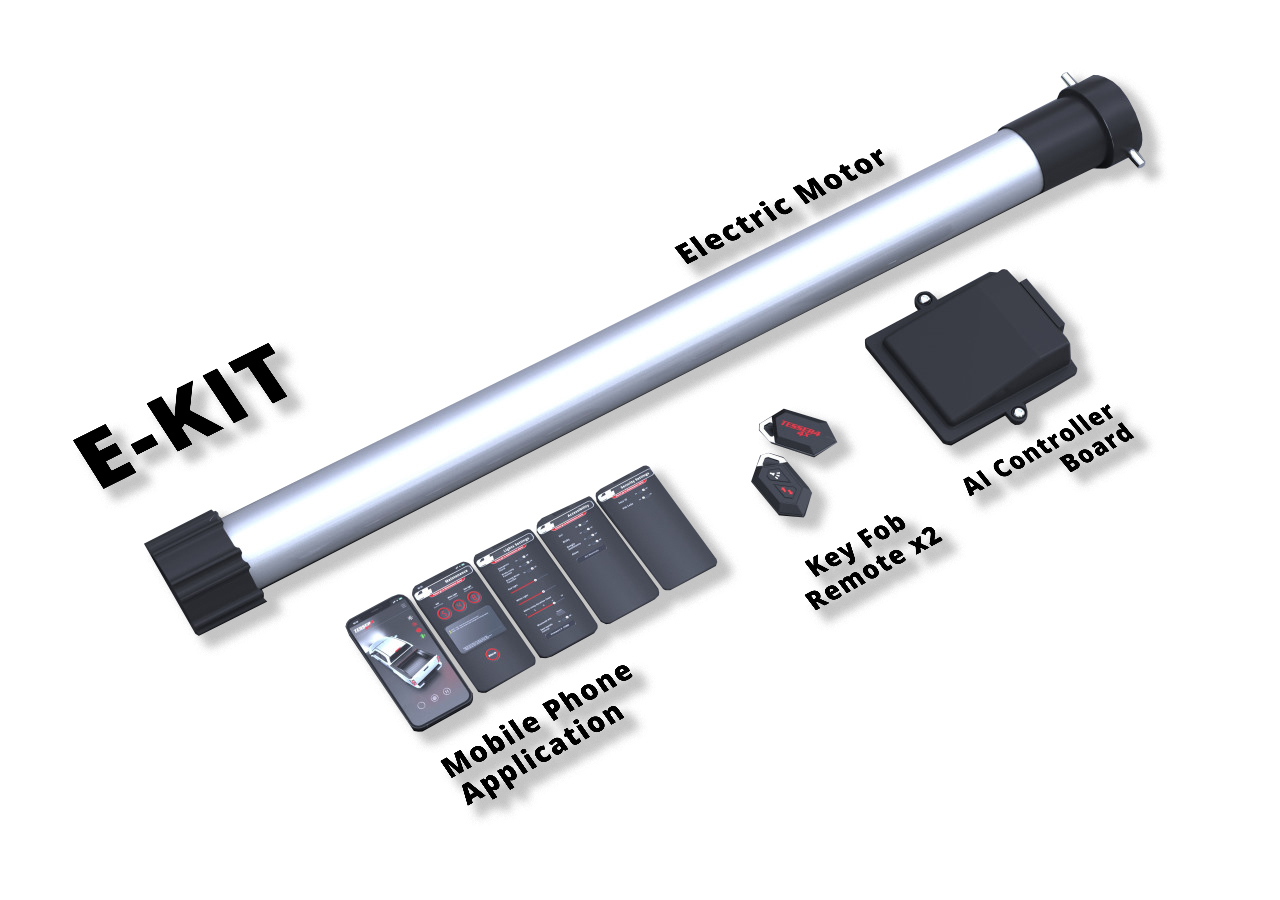 E-Kit: l’unico sistema di propulsione sul mercato mondiale che non richiede la calibrazione in base alla lunghezza del bagagliaio di ogni veicolo, poiché lo fa automaticamente grazie alla scheda di controllo AI. Motore elettrico con telecomando appositamente progettato. Triplo sistema di controllo (app per cellulare, azionamento dell’assetto posteriore “One Touch”, telecomando Key Fob)