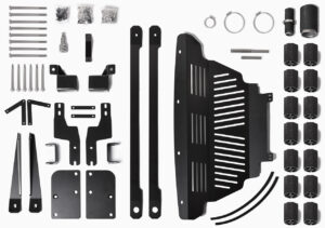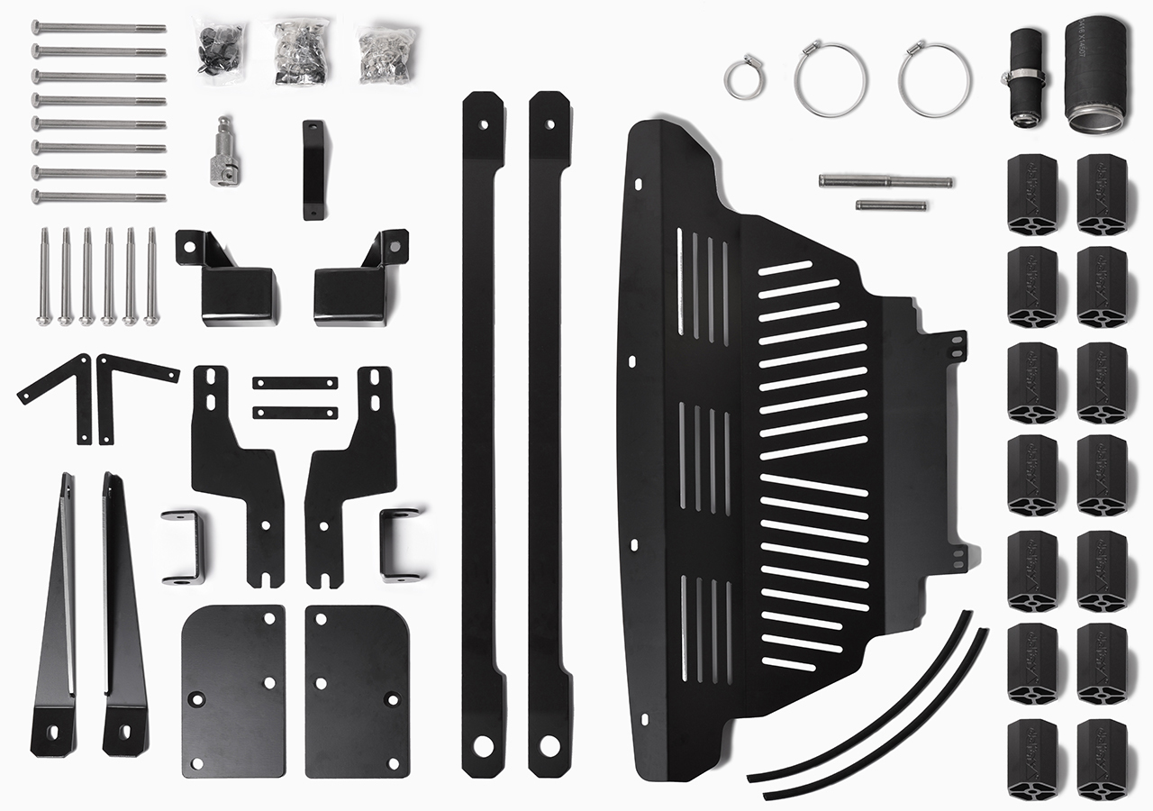 Questo pacchetto sospensioni comprende Body Lift, boccole delle sospensioni anteriori e protezione anteriore in alluminio rivestita con vernice strutturale nera, realizzata da Pickup Design.