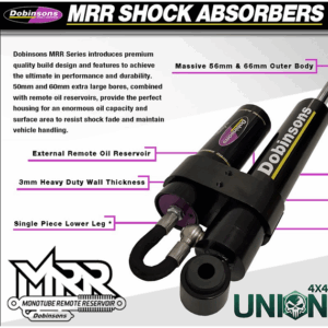 Oltre quattro anni di ricerca, sviluppo e test hanno portato alla creazione degli ammortizzatori Dobinsons Monotube Remote Reservoir. La serie MRR di Dobinsons è caratterizzata da un design e da componenti di alta qualità volti a garantire le massime prestazioni e durata. Pistoni estremamente grandi combinati con serbatoi remoti assicurano un’elevata capacità del fluido per resistere a un uso estremo e mantenere il controllo del veicolo.