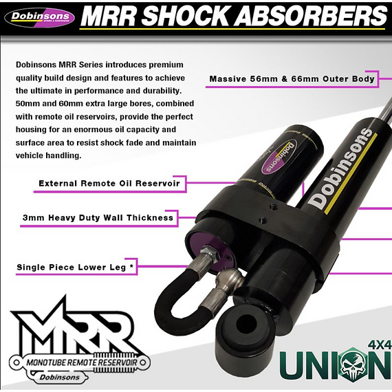 Over four years of research, development, and testing led to the creation of the Dobinsons Monotube Remote Reservoir shocks. The MRR series from Dobinsons features premium design and components aimed at maximum performance and durability. Extremely large pistons combined with remote reservoirs ensure high fluid capacity to withstand extreme use and maintain vehicle control.