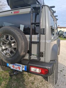 Nuovo allargamento di careggiata per questa Suzuki Jimny 2018 1.5L con applicazione di kit distanziali ruote, applicato kit verricello con supporto nascosto dietro paraurti originale, nuova scaletta posteriore e nuove barre portatutto con relativa cellula. Preparazioni Furlanetto 4×4.